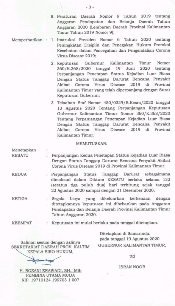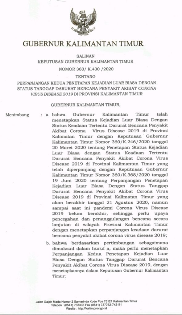 Mengingat dan melihat perkembangan Covid-19 semakin tinggi, maka status tanggap darurat dengan kejadian luar biasa diperpanjang kembali sejak 21 Agustus-31 Desember 2020 dengan nomor surat 360/K.430/2020 tentang perpanjangan kedua penetapan KLB dengan status tanggap darurat bencana penyakit akibat Covid-19 di Provinsi Kaltim.