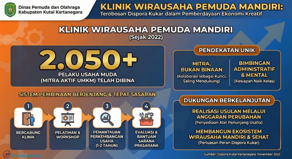 Kutai Kartanegara – Dinas Pemuda dan Olahraga (Dispora) Kabupaten Kutai Kartanegara (Kukar) terus membuktikan komitmennya dalam membangun kemandirian ekonomi generasi muda. Melalui terobosan program “Klinik Wirausaha Pemuda Mandiri”, Dispora Kukar tercatat sukses merangkul lebih dari 2.050 pelaku usaha muda sejak program ini digulirkan pada tahun 2022.