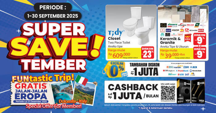 Program Super Savetember memberikan potongan harga besar untuk kebutuhan rumah dan renovasi, mulai dari Heatsafe Water Heater, aneka keramik dan granit, cat tembok Supersilk Anti Noda Avian Brands, Smart Lock Door Zehn, hingga perlengkapan kamar mandi dari Ceramax dan Tidy, serta tools dengan diskon hingga 39%.