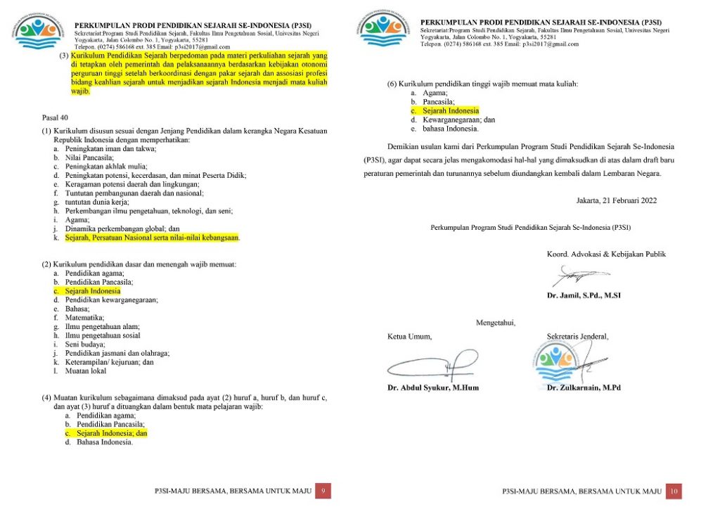 - Berdasarkan hasil kajian filosofis serta telaah akademis dari berbagai komponen termasuk Perkumpulan Program Studi Pendidikan Sejarah Se-Indonesia (P3SI), maka kami mengusulkan agar revisi Peraturan Pemerintah Nomor 4 Tahun 2022 Tentang Standar Pendidikan Nasional mencantumkan Sejarah Indonesia sebagaimana halnya mata pelajaran Pendidikan Pancasila, Pendidikan Kewarganegaraan dan Bahasa Indonesia sebagai muatan wajib pada jenjang pendidikan dasar, mata pelajaran wajib pada jenjang menengah dan mata kuliah wajib pada Pendidikan tinggi di seluruh wilayah hukum Pemerintah Republik Indonesia.