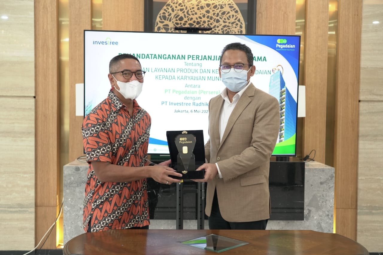 PT Pegadaian Persero jalin kerja sama dengan PT Investree Radhika Jaya dalam penyediaan layanan produk dan pemberdayaan karyawan sebagai agen Pegadaian, yang ditandai dengan penandatanganan Perjanjian Kerja Sama (PKS) antara Direktur Jaringan Operasi dan Penjualan PT Pegadaian (Persero), Damar Latri Setiawan dengan CEO PT Investree Radhika Jaya, Adrian A. Gunadi, di Kantor Pusat Pegadaian, Kamis (6/5).