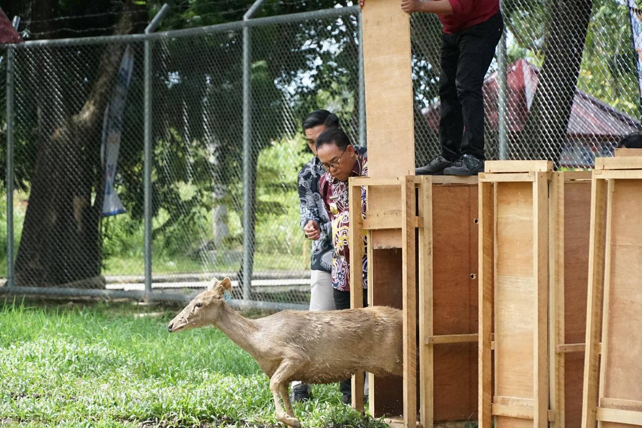 PENAJAM – Penjabat (Pj) Bupati Penajam Paser Utara (PPU), Makmur Marbun menyaksikan pelepasan binatang ikon PPU Rusa Sambar di Penangkaran milik Pemda yang berlokasi di belakang Kantor Bupati PPU pada Kamis 15/02/24.
