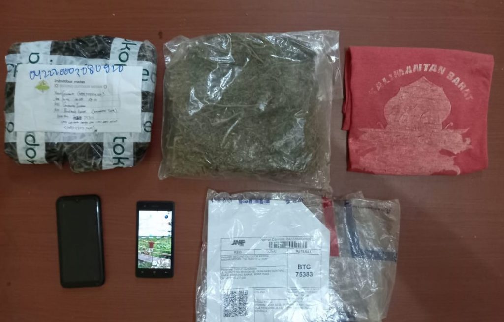 Adapun barang bukti yang berhasil diamankan adalah 1 bungkus plastik ganja berat Kotor 235,4 gram, 1 lembar kaos warna merah, 1 unit HP merk realmi warna biru, 1 unit HP merk oppo warna biru,1 buah bungkus paket dan 1 buah resi pengiriman barang.