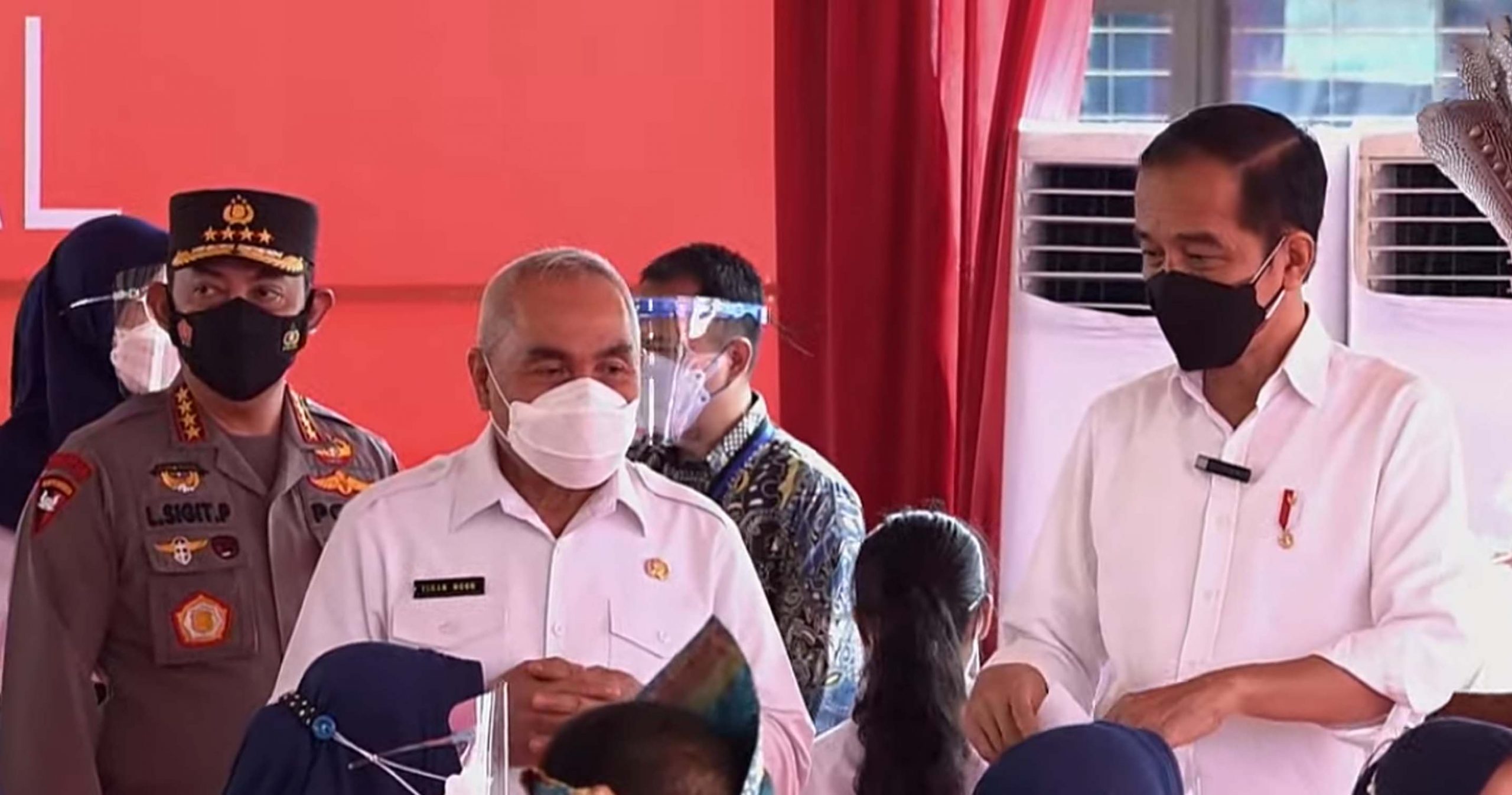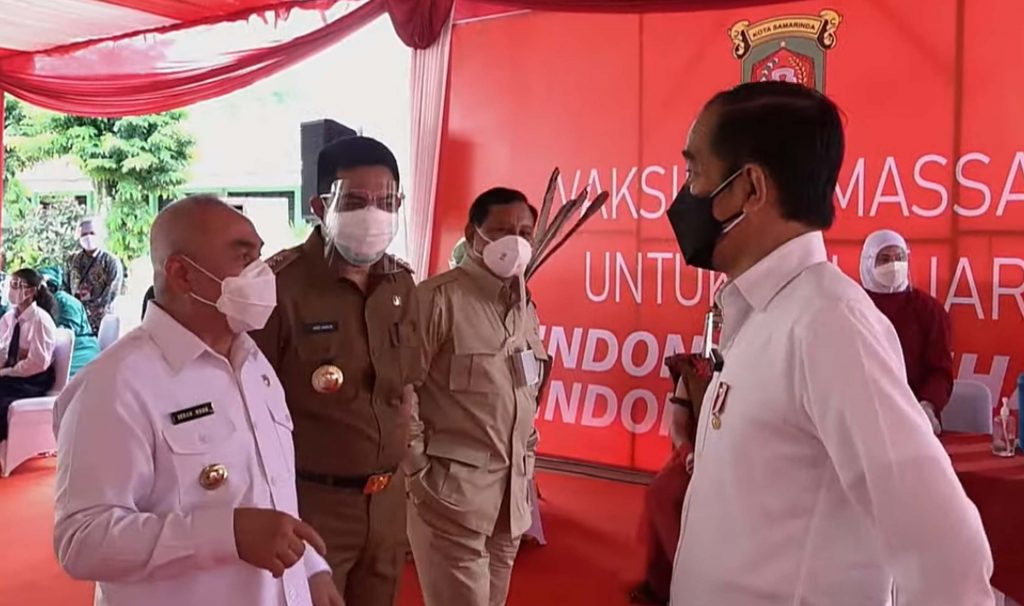 Dengan mengenakan kemeja puutih lengan panjang, Presiden Jokowi beserta Menteri Pertahanan (Menhan) Prabowo Subianto tiba di lokasi vaksinasi pukul 11.30 Wita. Setelah meninjau pelaksanaan vaksinasi, Jokowi mengadakan video conference dengan sembilan kabupaten kota yang ada di Kaltim.