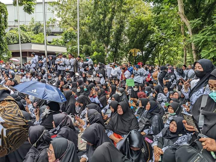 Samarinda, linimasa.co – Ribuan guru dari berbagai sekolah di Samarinda melakukan unjuk rasa di halaman Balai Kota Samarinda, Senin (3/09/2022). Dalam aksi damai ini para pendidik menuntut dipertahankannya tunjangan insentif yang selama ini diberikan kepada mereka.