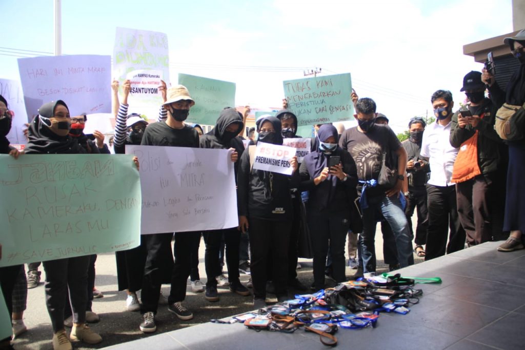 “2019 AJI menetapkan Kepolisian sebagai musuh kebebasan pers, jangan sampai tahun ini gelar itu dipertahankan. Jangan melakukan tindakan represif, baik ke jurnalis maupun kepada siapapun, karena tugas polisi melindung dan mengayomi ,” kata Edwin Agustyan, ketua FJB.